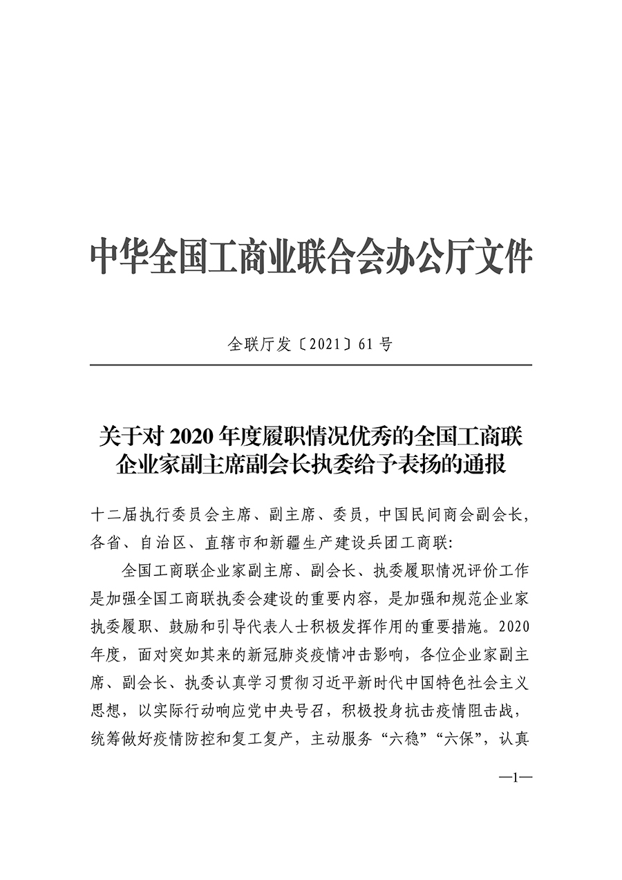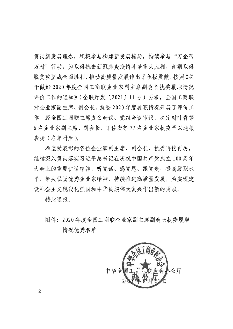 近日,全國工商聯(lián)發(fā)布《關(guān)于對2020年度履職情況優(yōu)秀的全國工商聯(lián)企業(yè)家副主席副會(huì )長(cháng)執委給予表?yè)P的通報》?!锻▓蟆分赋?,2020年度面對突如其來(lái)的新冠肺炎疫情沖擊影響,各位企業(yè)家副主席、副會(huì )長(cháng)、執委認真學(xué)習貫徹習近平新時(shí)代中國特色社會(huì )主義思想,以實(shí)際行動(dòng)響應中央號召,積極投身抗擊疫情狙擊戰,統籌做好疫情防控和復工復產(chǎn),主要服務(wù)“六穩”“六?!?,認真貫徹新發(fā)展理念,積極參與構建新發(fā)展格局,持續參與“萬(wàn)企幫萬(wàn)村”行動(dòng),為取得抗擊新冠肺炎疫情斗爭重大勝利、如期取得脫貧攻堅戰全面勝利、推動(dòng)高質(zhì)量發(fā)展作出了積極貢獻。按照《關(guān)于做好2020年度全國工商聯(lián)企業(yè)家副主席副會(huì )長(cháng)執委履職情況評價(jià)工作的通知》要求,全國工商聯(lián)對企業(yè)家、副主席、副會(huì )長(cháng)、執委2020年度履職情況開(kāi)展了評價(jià)工作。經(jīng)全國工商聯(lián)主席辦公室會(huì )議、黨組會(huì )議審議,決定對葉青等6名企業(yè)家副主席、副會(huì )長(cháng),丁佐宏等77名企業(yè)家執委予以通報表?yè)P。