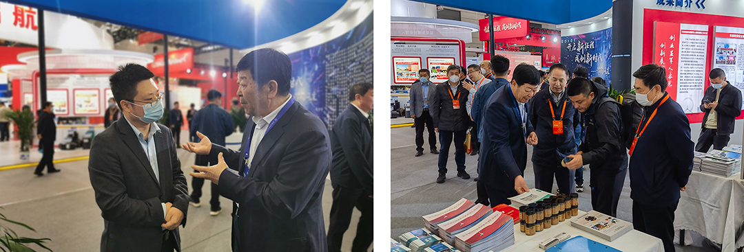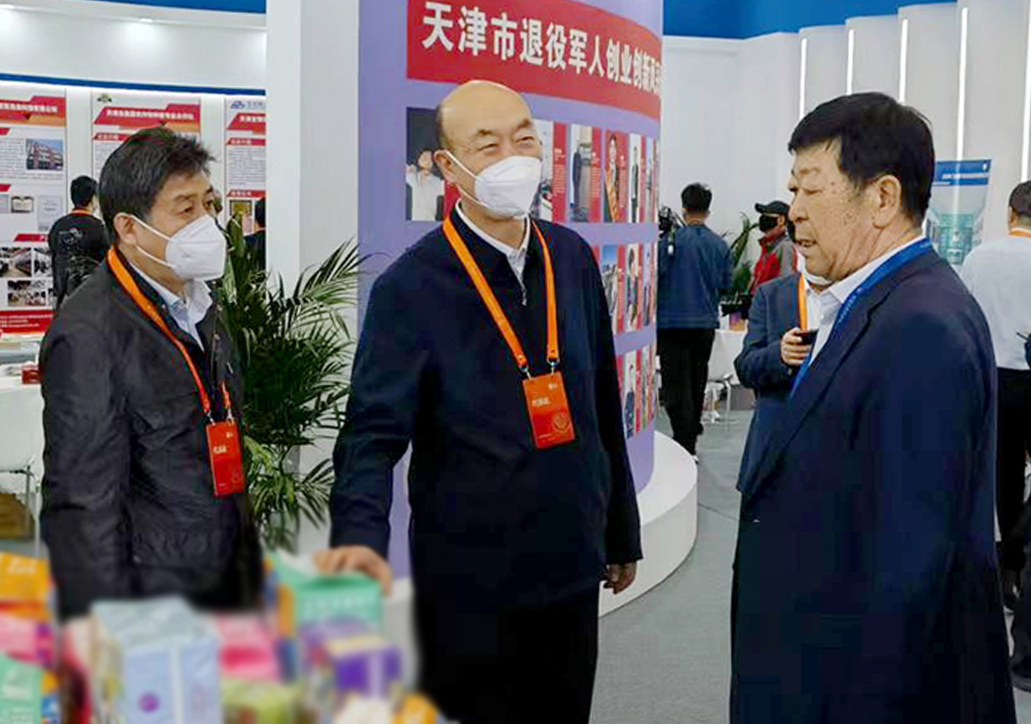 天津市退役軍人事務(wù)局副局長(cháng)程建國及相關(guān)領(lǐng)導與崔洪金在天津展區進(jìn)行交流
