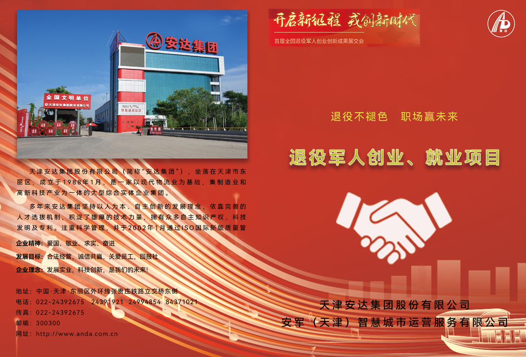 為培育壯大退役軍人市場(chǎng)主體,展示退役軍人創(chuàng )業(yè)創(chuàng )新風(fēng)采,增強廣大退役軍人投身服務(wù)經(jīng)濟社會(huì )發(fā)展的責任感和使命感,營(yíng)造全社會(huì )關(guān)心支持退役軍人創(chuàng )業(yè)創(chuàng )新的良好氛圍,首屆全國退役軍人創(chuàng )業(yè)創(chuàng )新成果展交會(huì )330日至41日在陜西省西安市國際會(huì )展中心舉辦。受退役軍人事務(wù)部就業(yè)創(chuàng )業(yè)司特邀,全國退役軍人優(yōu)秀代表、天津安達集團黨委書(shū)記、董事長(cháng)崔洪金企業(yè)多個(gè)項目和展品亮相展交會(huì )。
