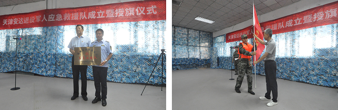 在主持人馬萍向崔洪金董事長(cháng)鏗鏘有力的請示后,活動(dòng)正式開(kāi)始。全體人員齊唱國歌,伴隨著(zhù)嘹亮的歌聲,五星紅旗冉冉升起。隨后全體人員移步二樓退役軍人之家,在全體領(lǐng)導、安達職工及職工子弟的共同見(jiàn)證下,全國“最美擁軍人物”崔洪金宣布“天津安達退役軍人應急救援隊”成立并帶領(lǐng)全體救援隊隊員宣誓。         在全體人員的共同見(jiàn)證下,區退役軍人事務(wù)局局長(cháng)曹硯海,區應急管理局黨委委員俞先軍分別向安達集團董事長(cháng)崔洪金、應急救援隊隊長(cháng)張恩欣授牌和授旗。
